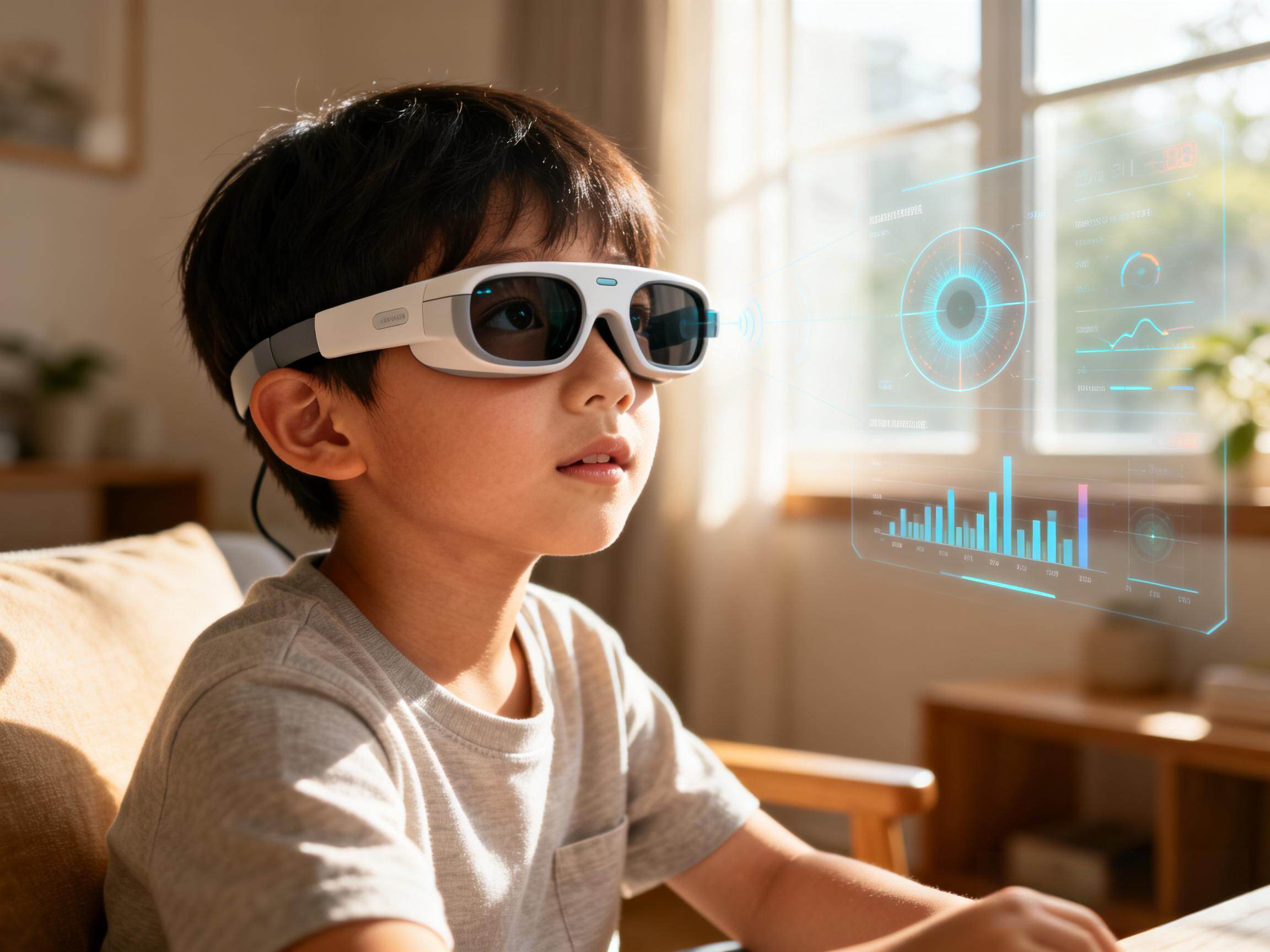 第一个,是让眼睛训练变得更智能。比如,有些孩子弱视、斜视,需要做视觉训练。以前,他们得一趟趟跑医院,很麻烦,孩子也很难坚持。如果用智能眼镜,就可以把训练内容直接放在眼镜里,让孩子在家就能做。眼镜里的摄像头还能一直盯着孩子的眼球,看他练得对不对,练得怎么样。眼镜里的人工智能,还能根据孩子的表现,自动调整训练难度。这就能解决以前最大的难题:训练效果没法衡量,家长也不知道孩子在家到底练得好不好。