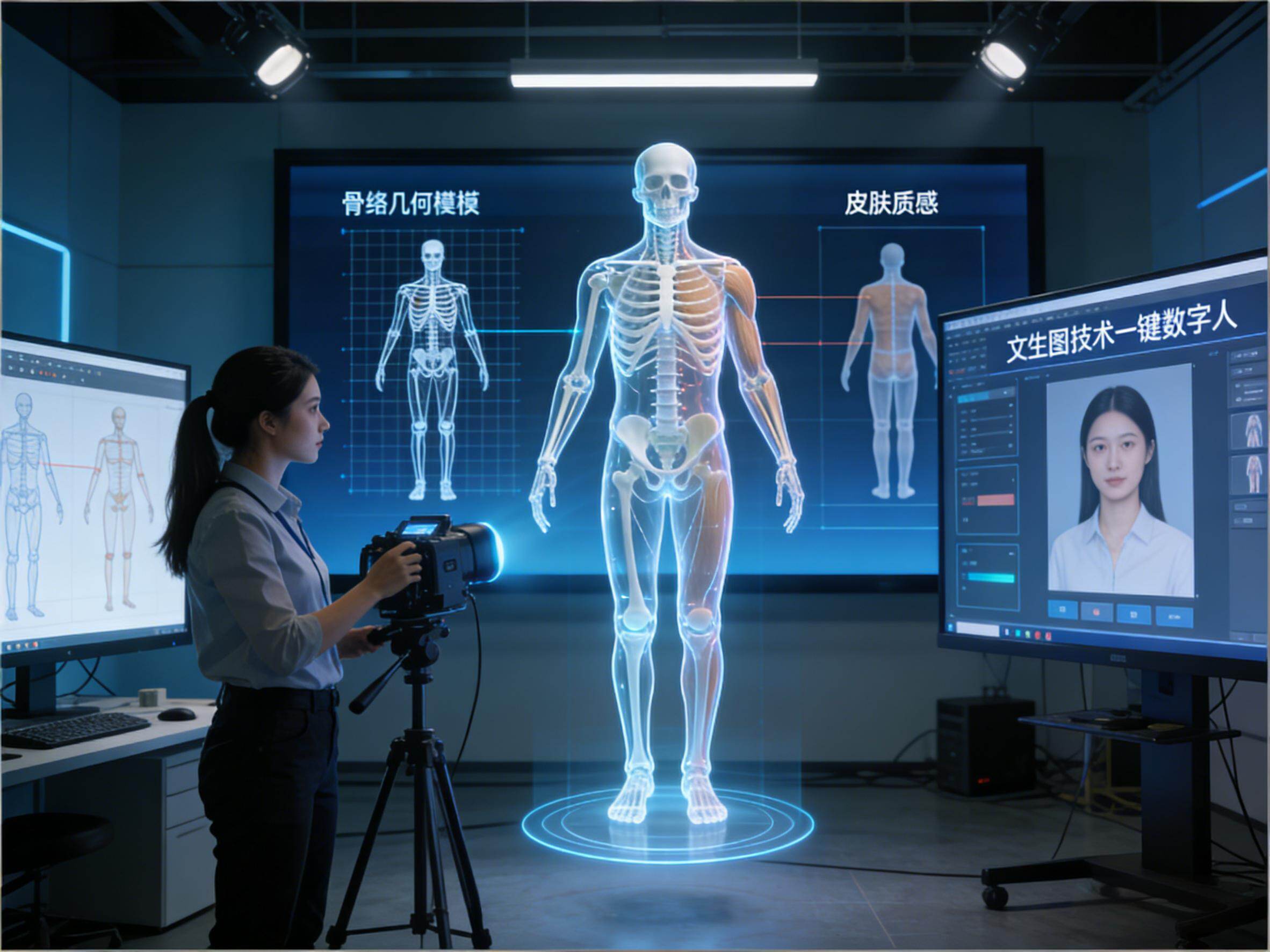 第一步,几何建模:搭建骨骼与皮囊,给数字人“造身”。这是数字人制作的基础,就像给数字人搭建骨架、塑造外形。首先,通过高清摄像头、激光扫描、手机拍摄等方式,采集真实人体的三维数据,确保数字人的外形能贴合人类的生理特征。然后,系统会根据采集到的数据,构建数字人的骨骼网格,就像真人的骨架一样,支撑起整个身体的形态;再填充皮肤网格,赋予皮肤的质感、颜色、纹理,让数字人的外形看起来更逼真。现在,随着技术的进步,通过文生图、文生视频技术,也可以直接通过文字描述,一键生成全新的3D数字人形象,大大降低了数字人的制作门槛,让更多人有机会拥有自己的数字人。