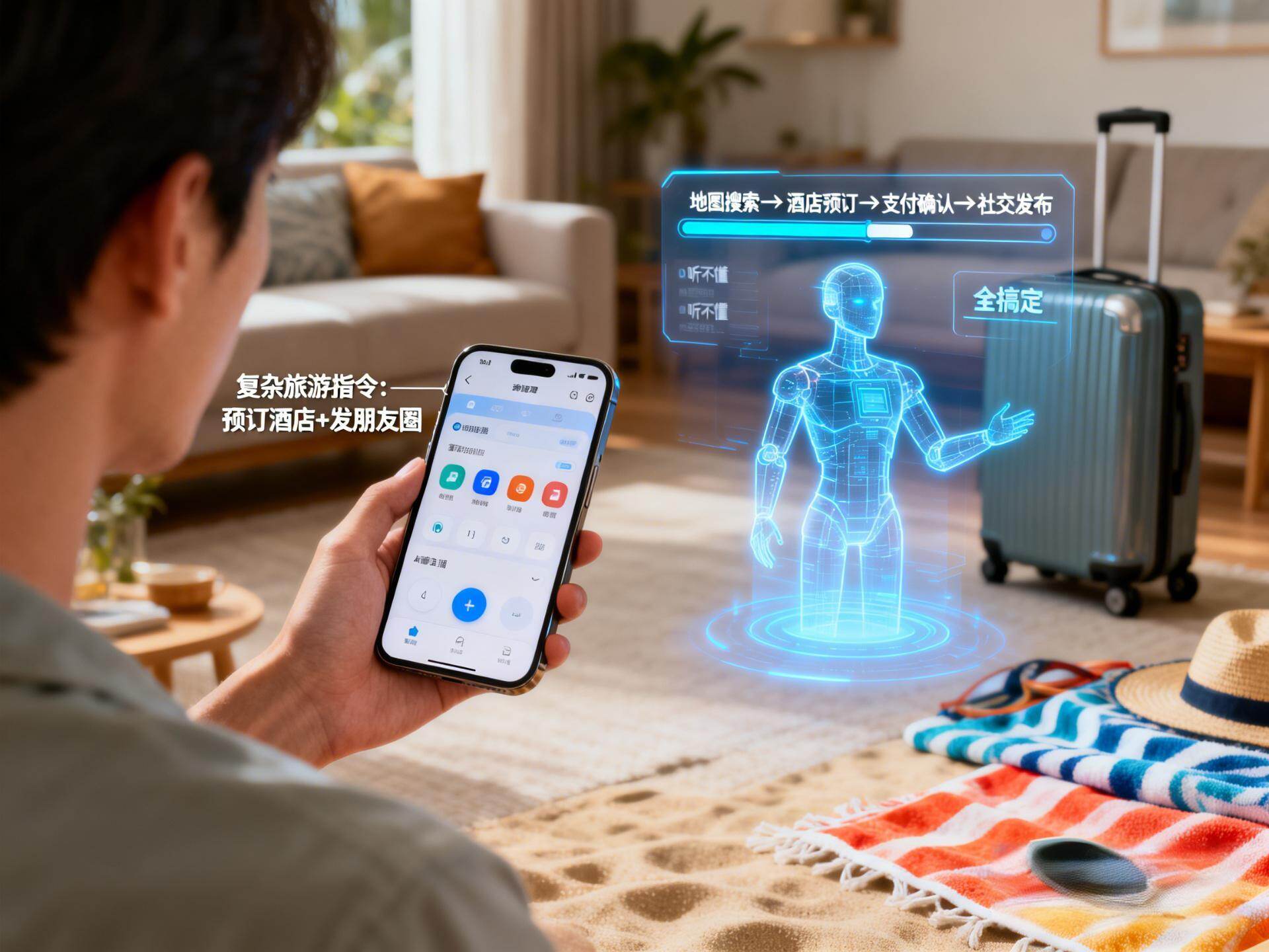 不是它不想帮你做,而是它无法和其他系统协同工作。普通语音助理能帮你定闹钟、查天气,因为这些都是它自身系统能完成的事情,但订酒店需要调用酒店APP的数据接口,发朋友圈需要调用社交APP的接口,而普通语音助理无法打通这些不同的APP,无法实现协同工作,自然也就无法完成复杂的任务。