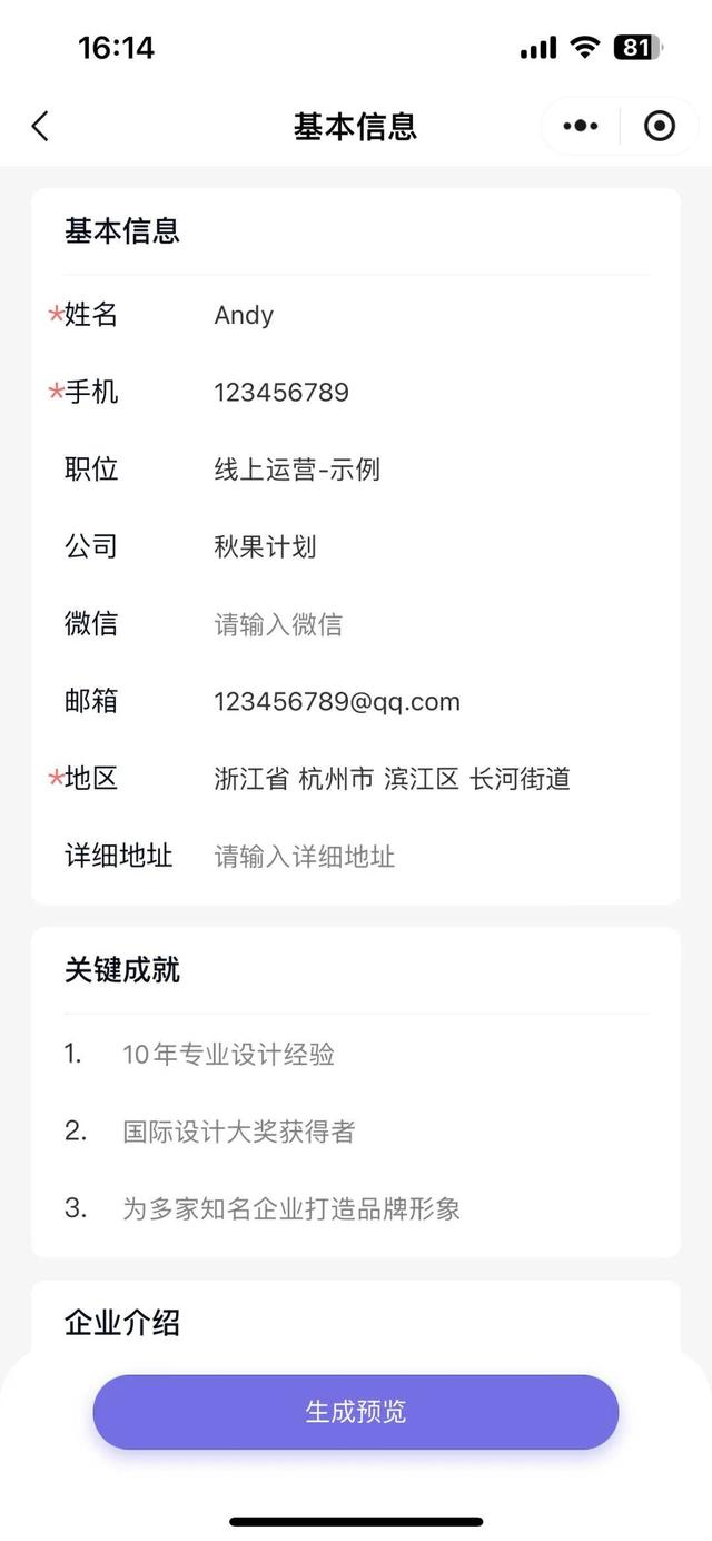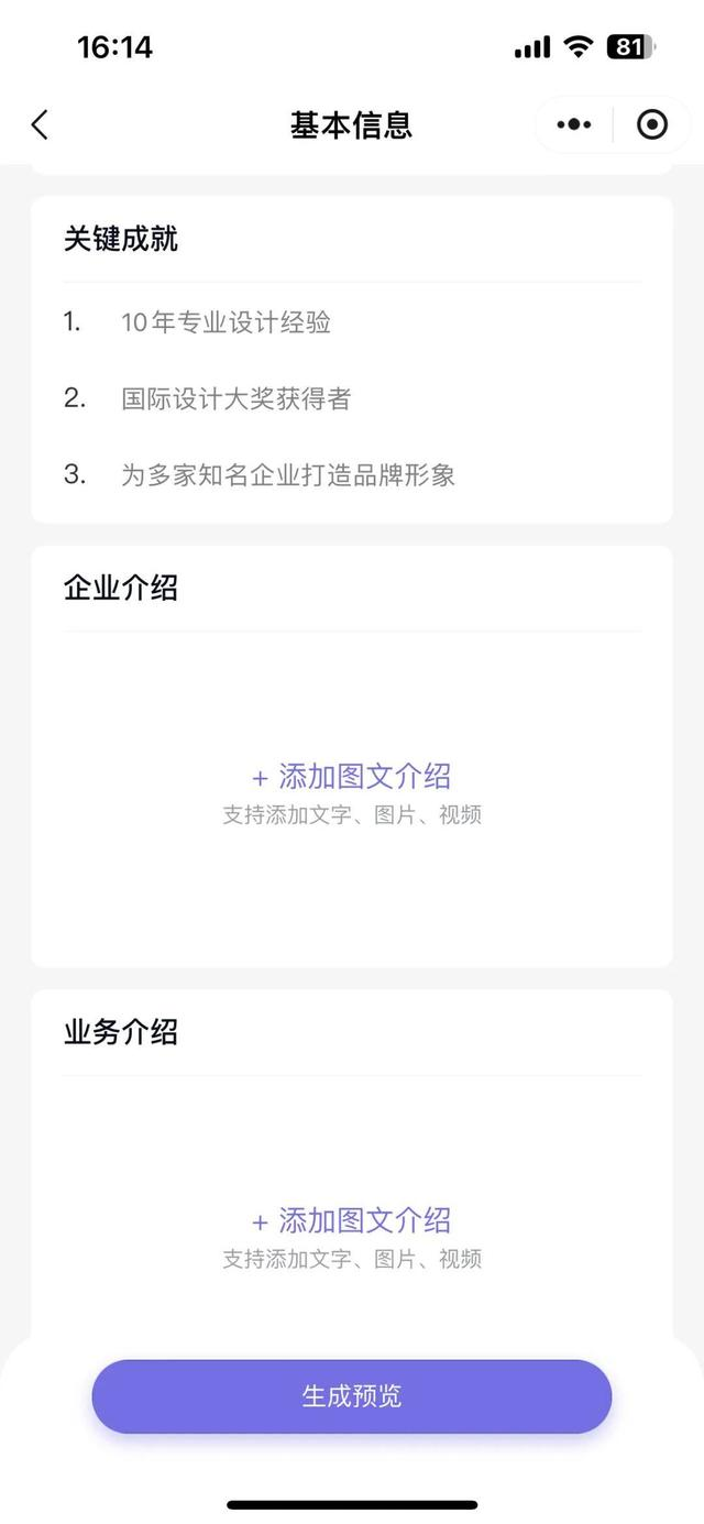 4.添加附加信息:根据需要,添加个人介绍、公司介绍、产品服务等附加信息。这些信息可以以文字、图片、音频、视频等多种形式呈现。