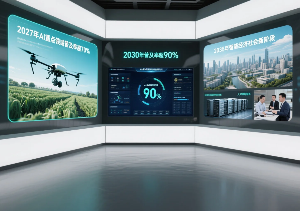 该政策明确了阶段性目标:到2027年,人工智能在重点领域应用普及率超70%;到2030年,赋能高质量发展成效显著,普及率超90%;到2035年,全面进入智能经济与社会发展新阶段。为实现这些目标,国家将强化算力、数据、人才、安全等基础支撑体系,系统推进人工智能融合应用落地。