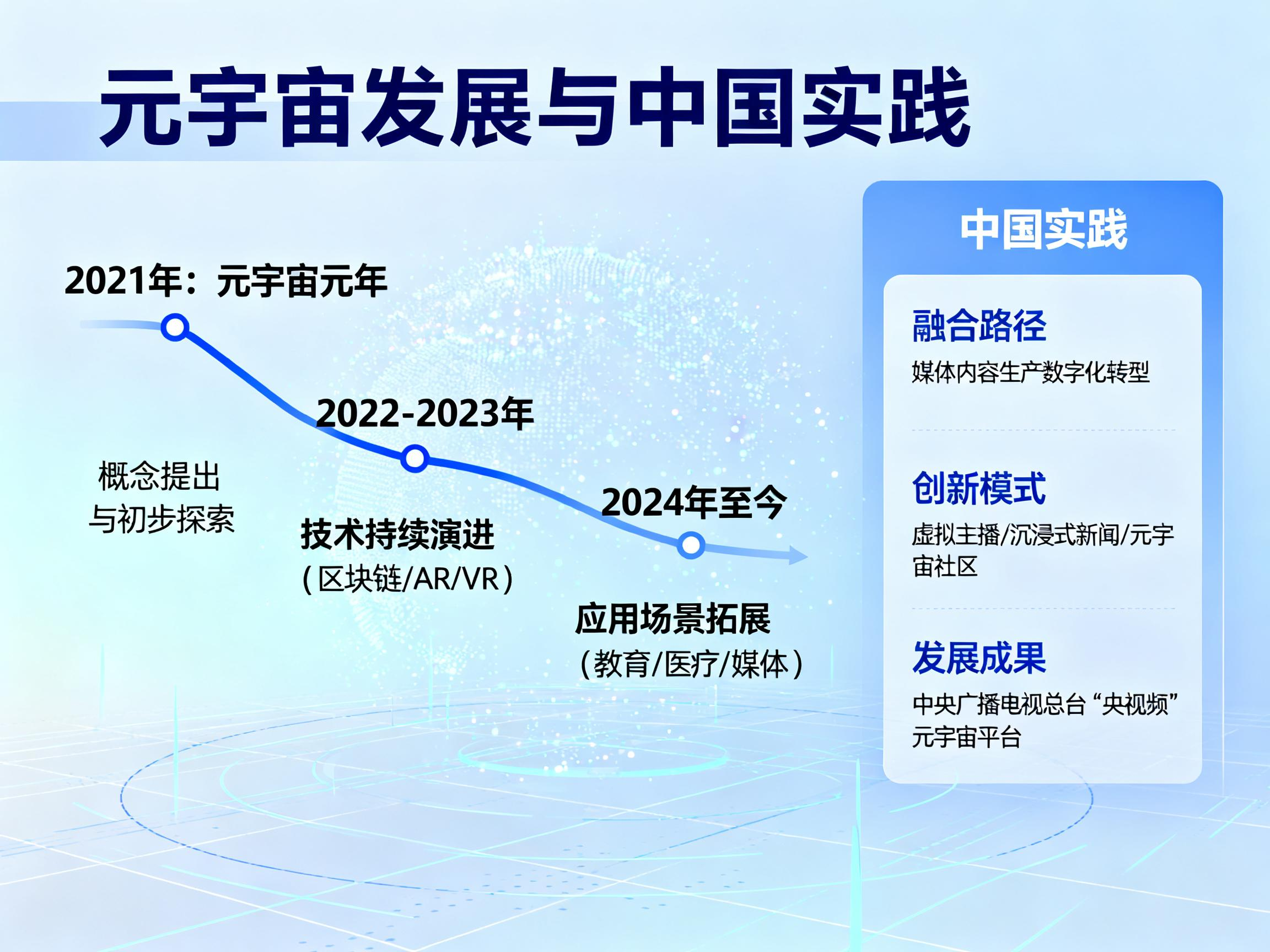 从技术架构来看,元宇宙是由虚拟空间、应用程序和对象组成的庞大网络,用户可通过计算机、手机和虚拟现实设备等多种终端进行访问。2023至2024年间,中国的元宇宙实践涵盖了技术研发、商业应用等多个领域。特别是在媒体融合方面,元宇宙技术与新闻生产、内容分发、用户互动等环节深度结合,创造了全新的媒体形态。